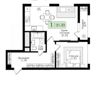 51,4 м2, 1-комнатная квартира