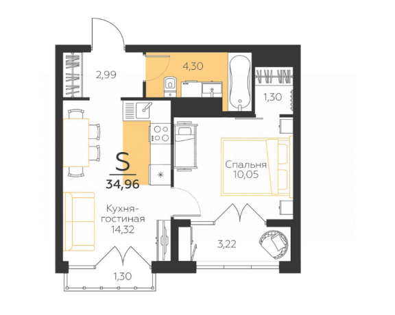 34,96 м2, 1-комнатная квартира