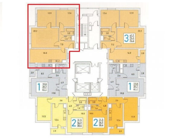 - Площадь комнат22.2 кв.м., 12.9 кв.м., 12.6 кв.м.