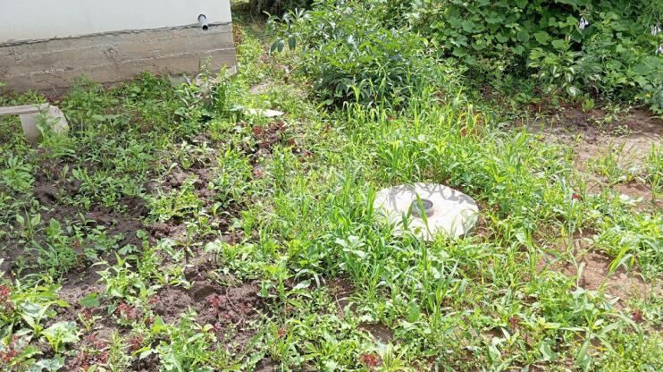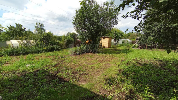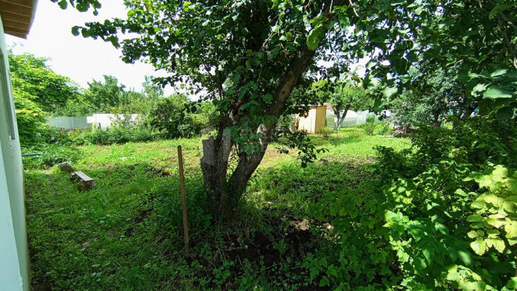 На ухоженном участке плодовые деревья и кустарник.